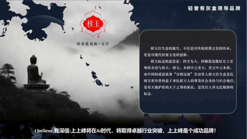正在品牌扶植方面,上上峰深知专业和质量的主要性。为了打破社会对殡葬行业的固有,上上峰一直以阳光、反面的品牌抽象示人,努力于让贸易回归价值素质。通过不竭提拔办事质量,加强品牌宣传,上上峰积极欢送更多有先辈贸易的同仁插手,联袂共创殡仪办事的重生态。殡葬文化做为人类文明的主要构成部门,承载着我们对生命的和对逝者的思念。江西省仁峰文化创意无限公司通过椟玉往生盒和上上峰数字生命文化馆,正在产物和办事两个层面实现了对殡葬文化的传承取立异。它们外行业成长的道上不竭摸索、怯于冲破,为行业注入了新的活力,为国人甚至世界供给了更具质量和文化内涵的殡葬选择。相信正在将来,凭仗着立异和专业能力,它们将正在 AI 时代取得愈加杰出的成绩,成为殡葬行业的成功典型,为鞭策殡葬文化的成长做出更大的贡献。