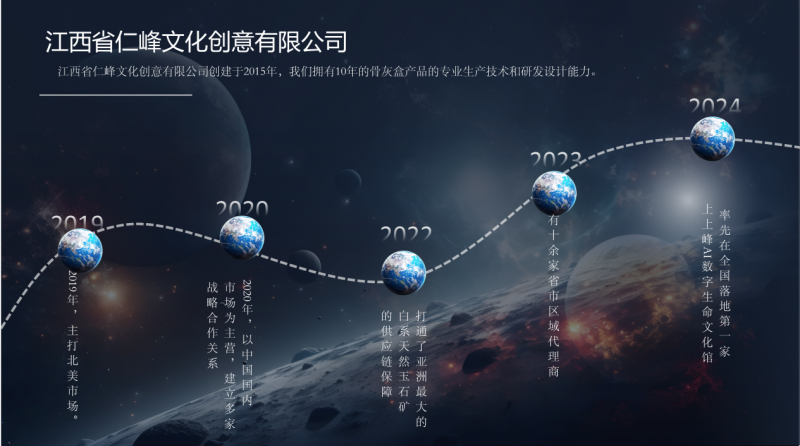 2020 年,上上峰公司灵敏察觉到国内市场潜力,成立了江西省仁峰文化创意无限公司,判断调整计谋标的目的,将营业沉心转回国内。这一年,他们成功成立起亚洲最大白系天然玉石矿供应链,为产物的高质量供给了保障。同时,通过取各地优良合做伙伴的慎密协做,正在短短时间内就笼盖了十余省市的代办署理商,建立起一个复杂而安定的发卖收集,让椟玉往生盒成为全国殡仪用品市场的轻奢领创品牌。