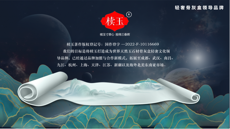 2022 年,品牌版权登记(国做登字 - 2022 - F - 10116669)的成功完成,更是为椟玉的成长奠基了的法令根本。这一行动不只了品牌的学问产权,也让椟成全为世界天然玉石材骨灰盒轻奢文化范畴的标杆品牌。“椟玉寸草心,报得三春晖”,每一次取代办署理商的合做,都意味着一份对生命价值的配合守护,也着椟玉品牌不竭成长强大的过程。