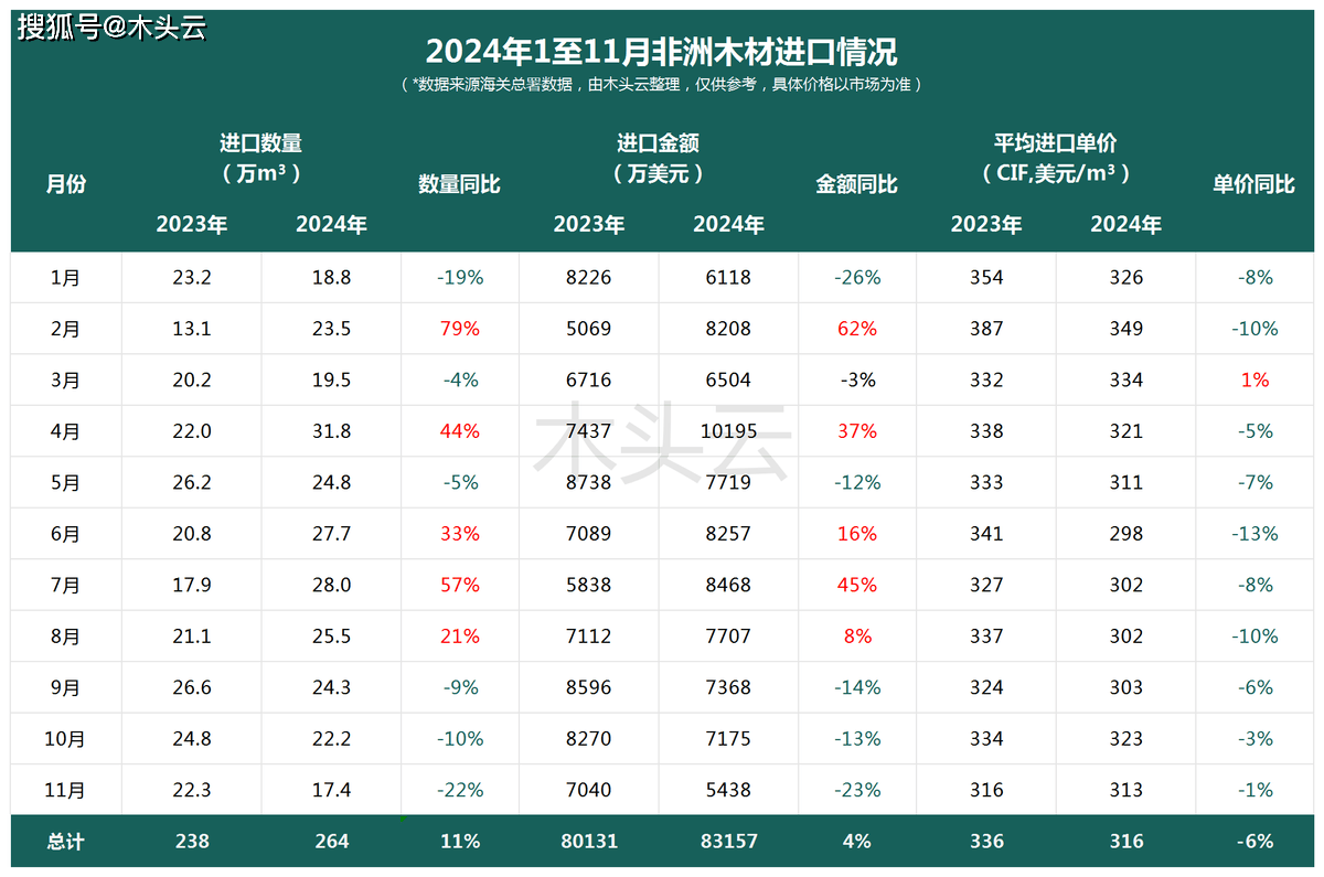 值得留意的是,2024年以来,非洲木材的进口单价一曲维持正在低于2023年同期的程度。虽然11月的进口平均单价降幅有所收窄,从进口布局来看,非洲原木和锯材的表示呈现两极分化。数据显示,具体而言,取2023年同期比拟削减了44%,平均进口单价也下降了8%。比拟之下,非洲锯材的进口量则实现了显著增加,11月的进口量高达7。7万立方米,同比增加了58%,但其平均进口单价也下降了12%。